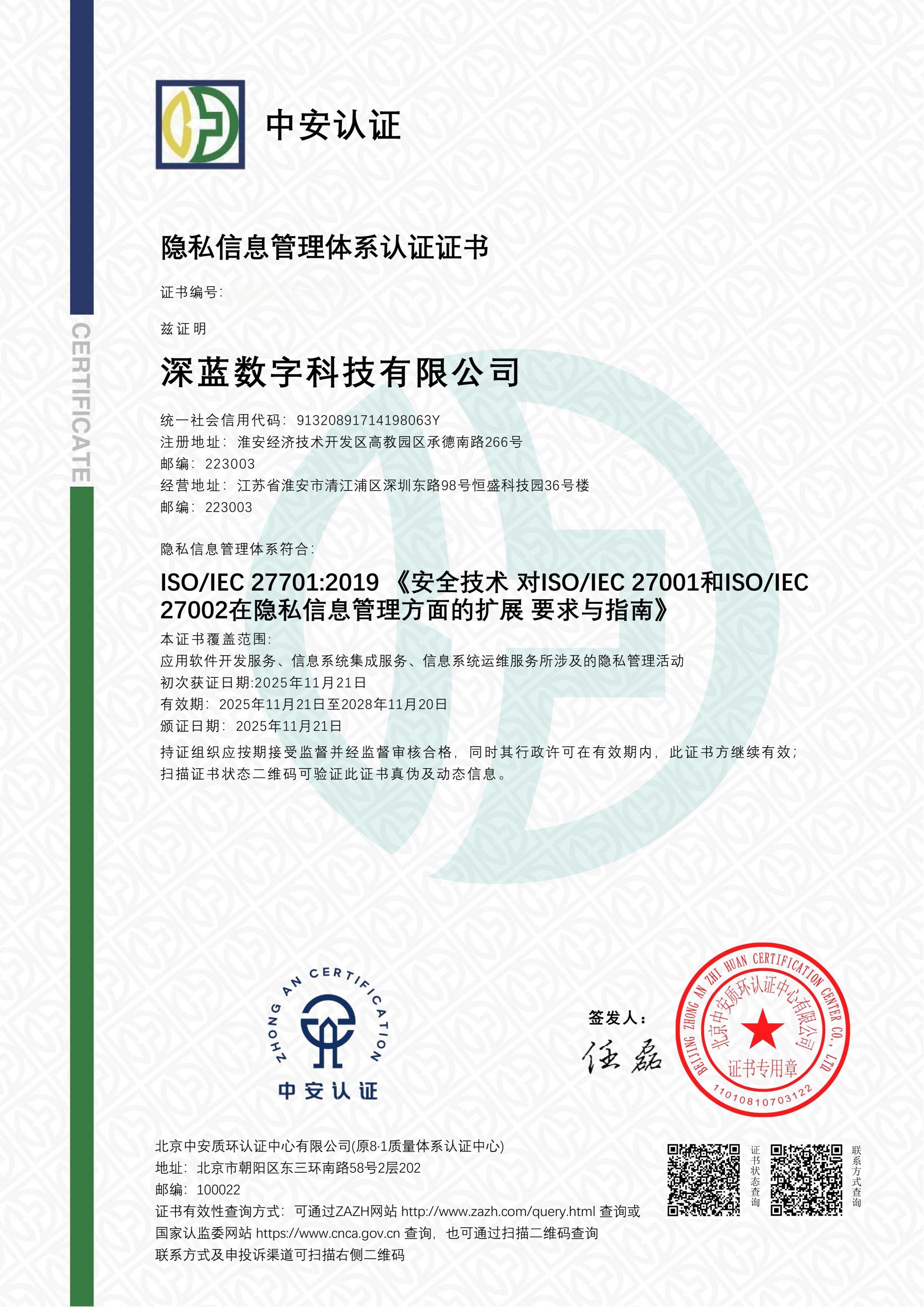 隱私信息管理體系認(rèn)證證書